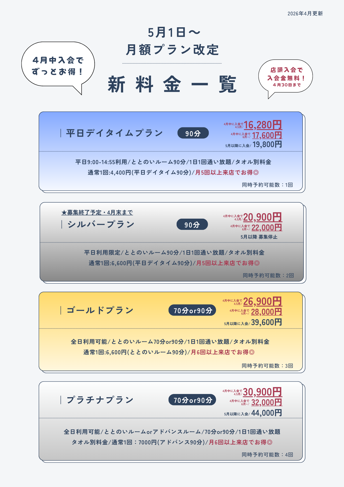 ■新規会員様の新料金(※5月1日以降入会の方)